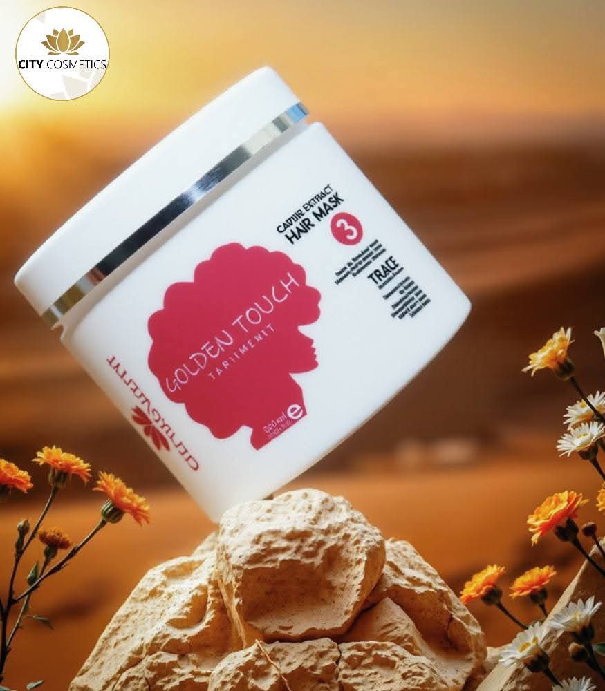 Golden Touch Hair Mask من City Cosmetics هو حمام كريم فاخر غني بخلاصة الكافيار، زيت الأرجان، وزيت الأساي، يعمل على تغذية الشعر بعمق وإصلاح التلف الناتج عن الحرارة والصبغات.